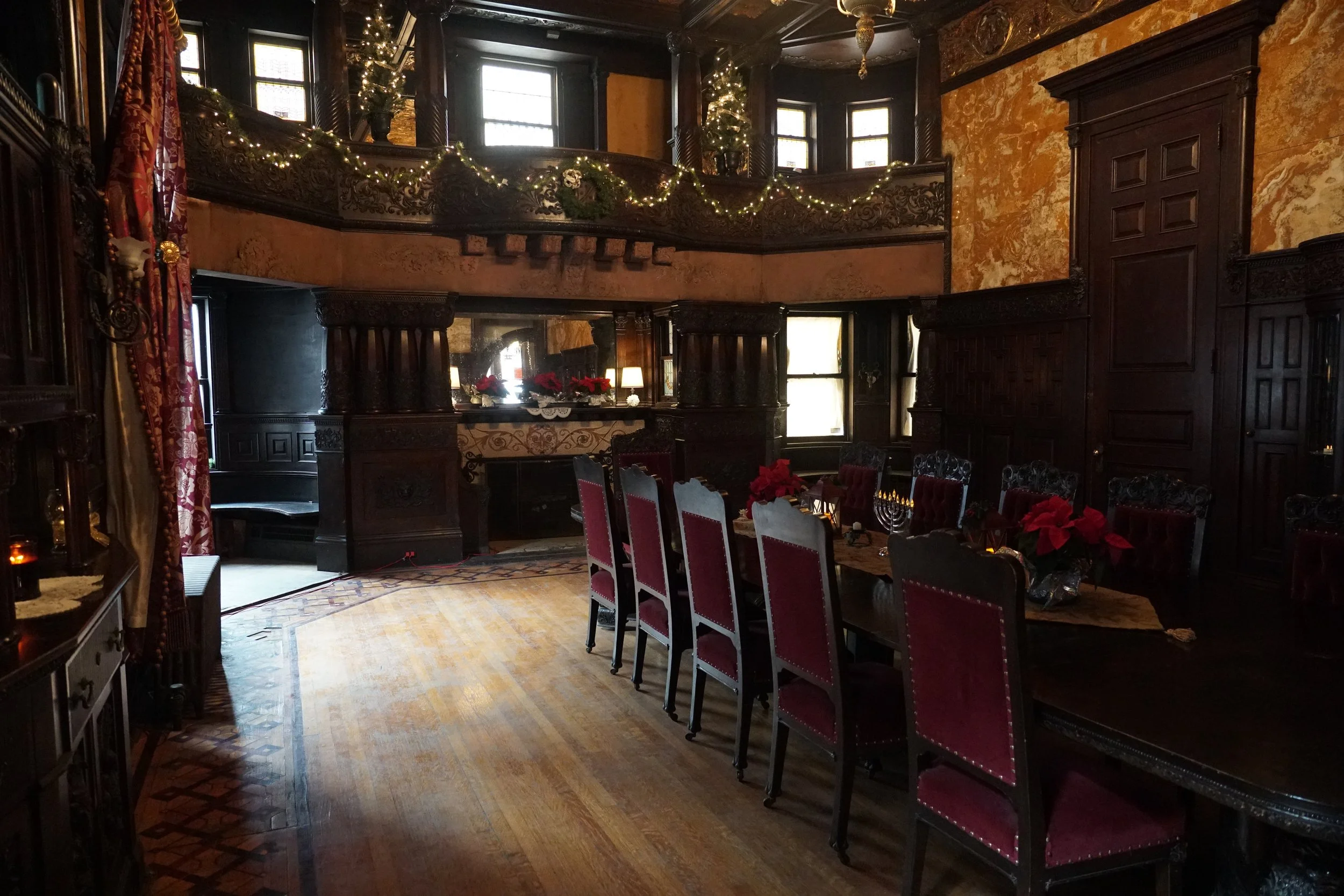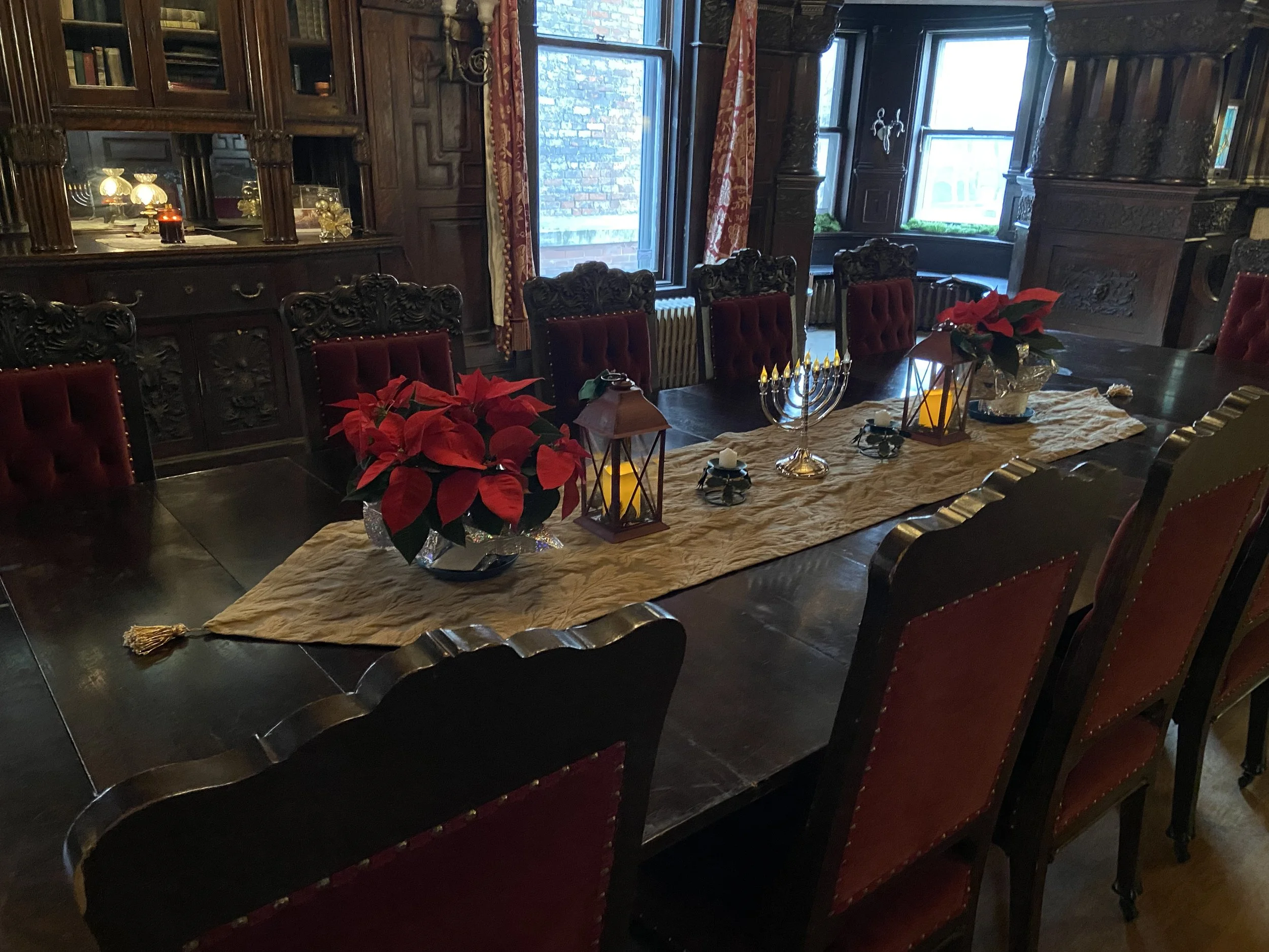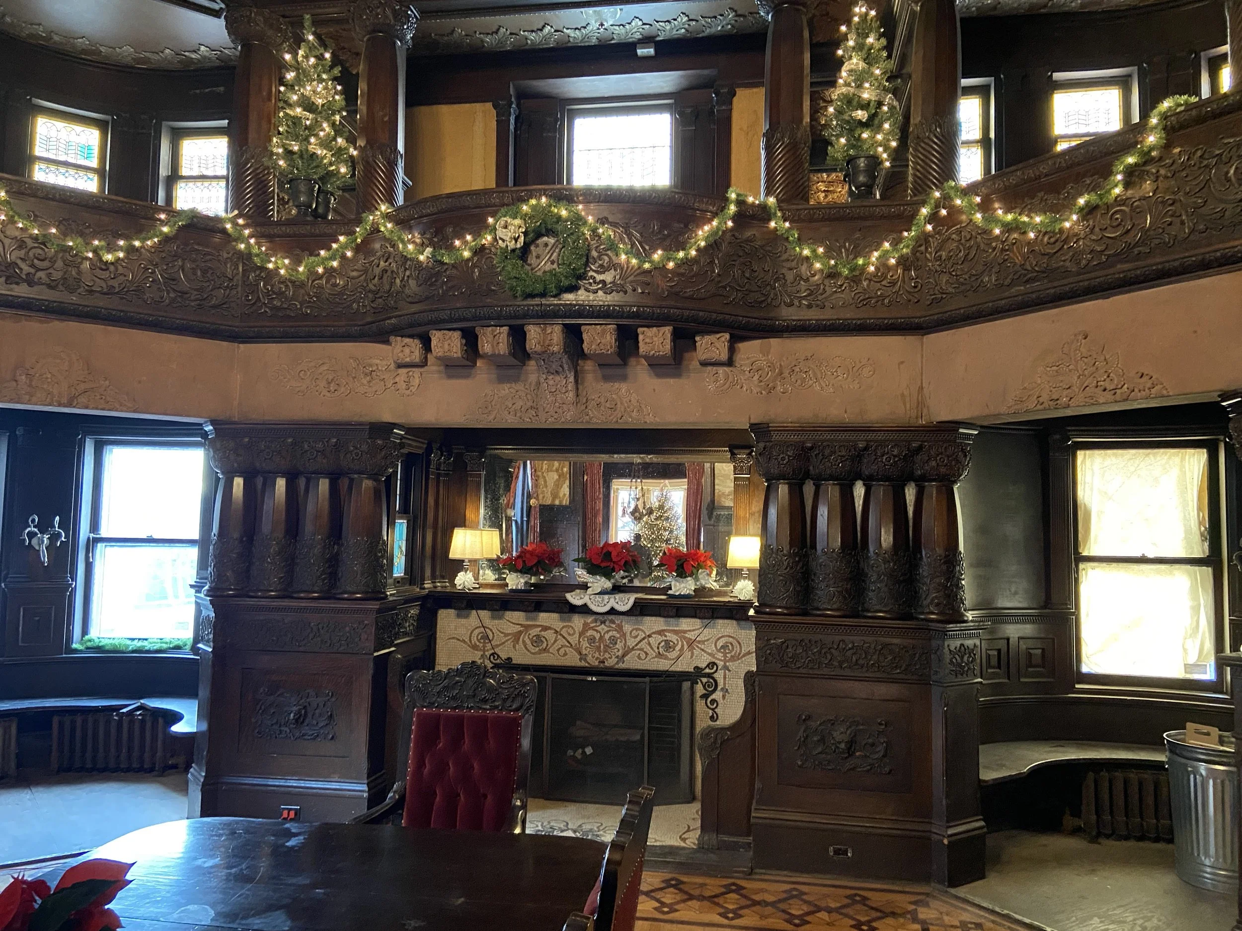 The Paine Castle welcomes you from the moment you arrive outside the mansion – garlands and wreaths of fresh greenery stretch across the entire front of the home, twinkling with hundreds of white lights. As you enter the foyer of the home, the magnificent staircase and fireplace are decorated with more garlands and swags of greenery, as well as festive red poinsettias. Entering the front parlor, your breath will catch as you view the 14-foot Christmas tree lit to perfection with more white lights and traditional silver and gold decorations. Moving into the center of the mansion you view another large Christmas tree shimmering with red and gold ribbons with matching ornaments to complement the room’s décor. Christmas magic continues in the spectacular dining room where sparkling trees and more greenery adorn the balcony. The dining room table is decorated with more poinsettias and lanterns. Additional red poinsettias flank the mantle on the mosaic fireplace. Just around the corner from the dining room is the Butler’s Room, tastefully decorated in green, gold, and red across the fireplace mantle.