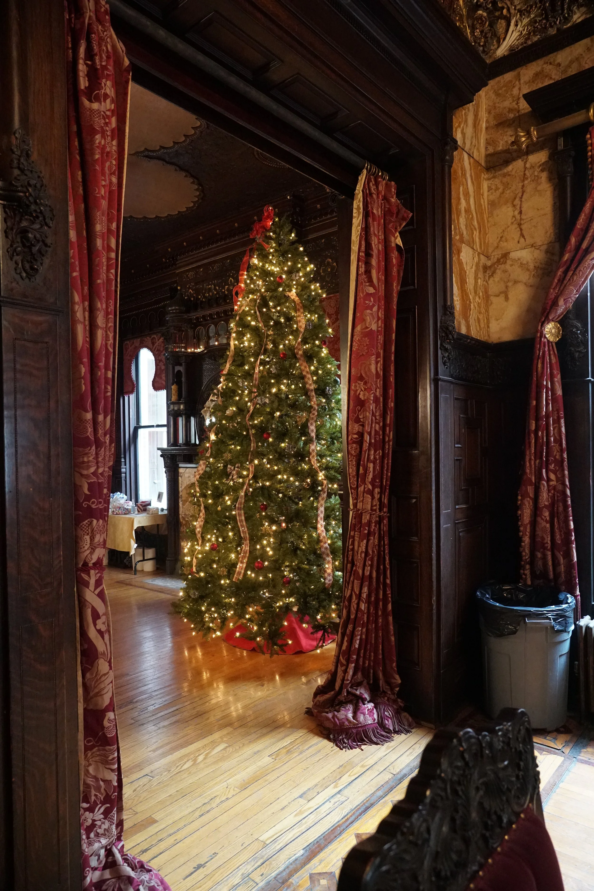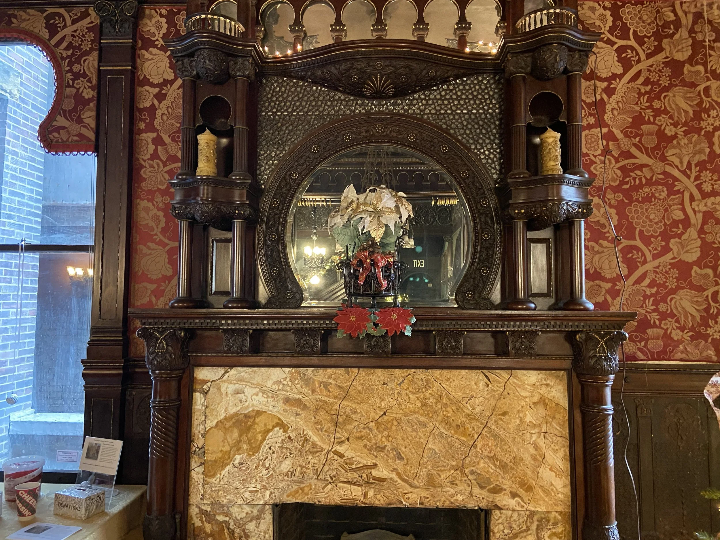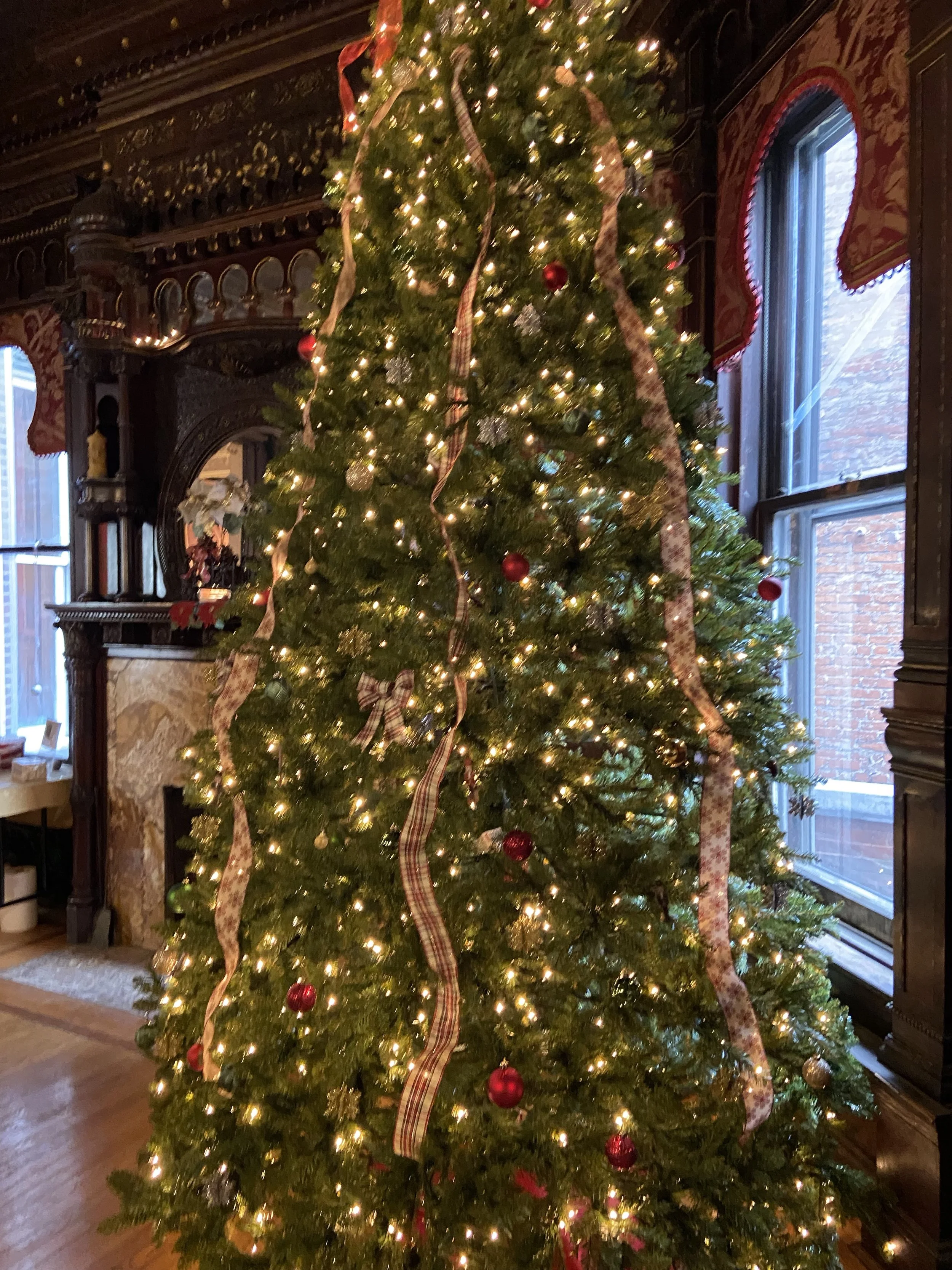 The Paine Castle welcomes you from the moment you arrive outside the mansion – garlands and wreaths of fresh greenery stretch across the entire front of the home, twinkling with hundreds of white lights. As you enter the foyer of the home, the magnificent staircase and fireplace are decorated with more garlands and swags of greenery, as well as festive red poinsettias. Entering the front parlor, your breath will catch as you view the 14-foot Christmas tree lit to perfection with more white lights and traditional silver and gold decorations. Moving into the center of the mansion you view another large Christmas tree shimmering with red and gold ribbons with matching ornaments to complement the room’s décor. Christmas magic continues in the spectacular dining room where sparkling trees and more greenery adorn the balcony. The dining room table is decorated with more poinsettias and lanterns. Additional red poinsettias flank the mantle on the mosaic fireplace. Just around the corner from the dining room is the Butler’s Room, tastefully decorated in green, gold, and red across the fireplace mantle.